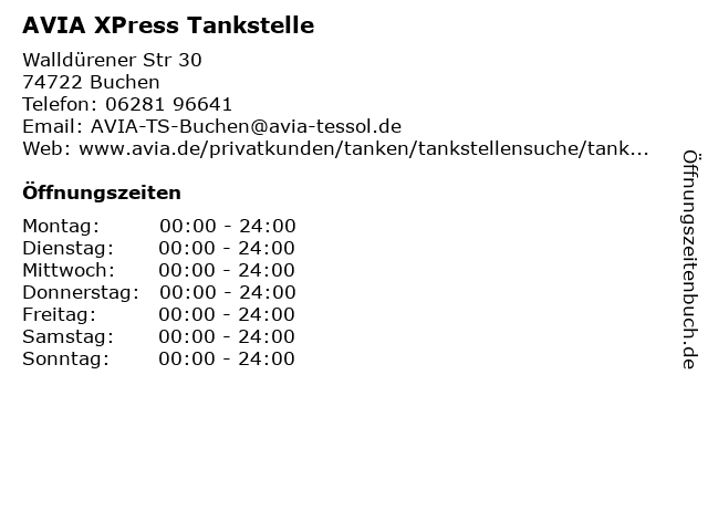 | Öffnungszeiten AVIA XPress Tankstelle in Buchen anzeigen | |