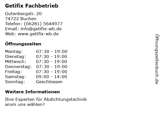 | Öffnungszeiten Getifix Fachbetrieb in Buchen anzeigen | |