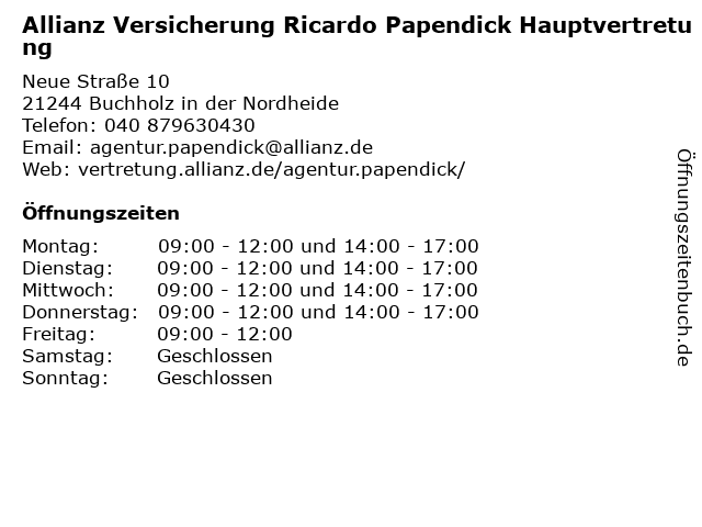 1 Allianz Versicherung Lisa Aydin Hauptvertretung (Entfernung: 0,00 km) Neue Straße 10, 21244 Buchholz in der Nordheide 3 Allianz Versicherung Jörg Thorsten Scharenberg Hauptvertretung (Entfernung: 4,40 km) Bergweg 41, 21266 Jesteburg 6 |