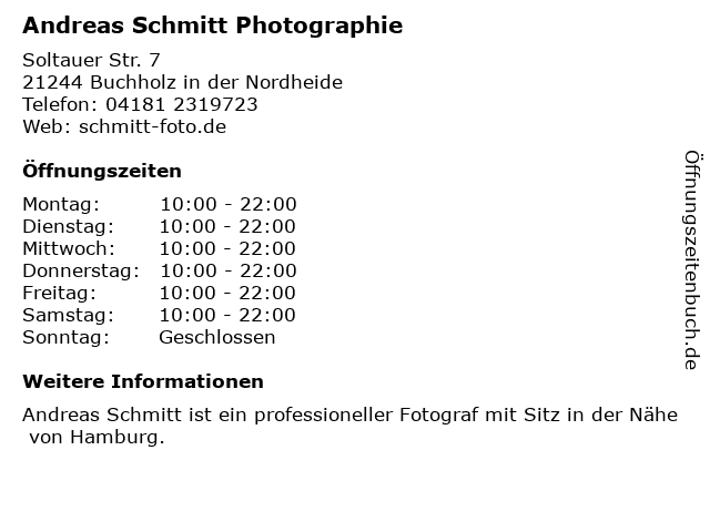 3 Rita Kruse Photographie + Postproduction (Entfernung: 4,44 km) Jungfernstieg 2b, 21244 Buchholz in der Nordheide 4 Dr. med. Jörg Schmitt & Dr. med. Bettina Schmitt - Praxis für Allgemeinmedizin (Entfernung: 11,63 km) Ollsener Str. 20, 21271 Hanstedt 6 |