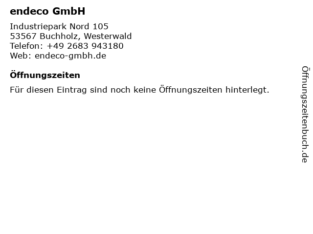 | Öffnungszeiten endeco GmbH in Buchholz, Westerwald anzeigen | |