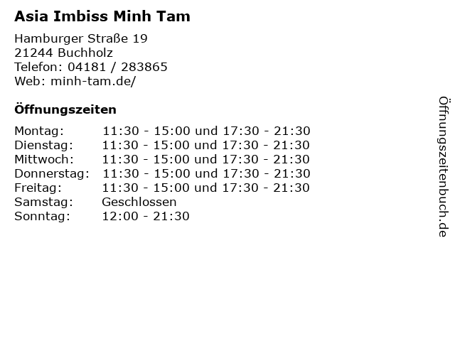 | Öffnungszeiten Asia Imbiss Minh Tam in Buchholz anzeigen | |