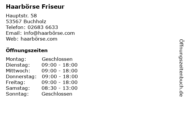 | Öffnungszeiten Haarbörse Friseur in Buchholz anzeigen | |