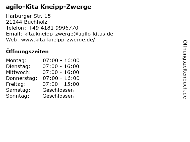 | Öffnungszeiten agilo-Kita Kneipp-Zwerge in Buchholz anzeigen | |