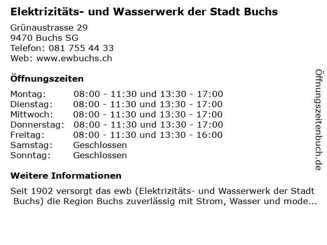 Öffnungszeiten Elektrizitäts- und Wasserwerk der Stadt Buchs