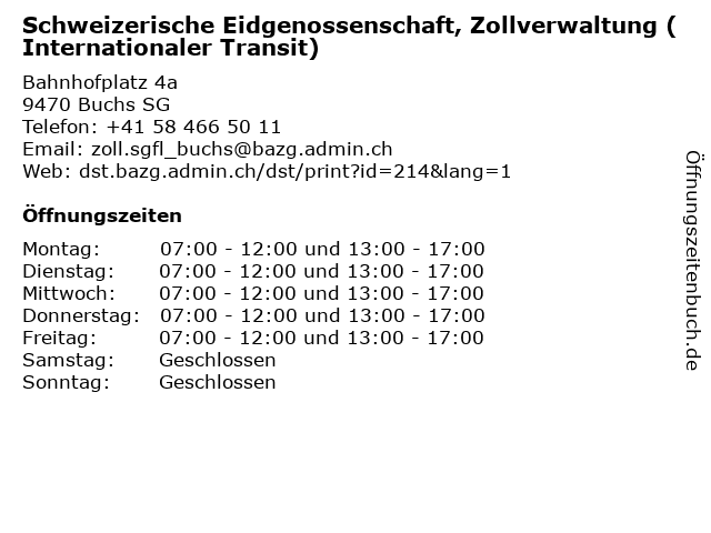1 Schweizerische Eidgenossenschaft - Zollverwaltung (Handelswaren) (Entfernung: 0,00 km) Bahnhofplatz 4a, 9470 Buchs SG 4 Securitas AG Schweizerische Bewachungsgesellschaft - Geschäftsleitung (Entfernung: 3,86 km) Landstrasse 38, 9490 Vaduz 6 |