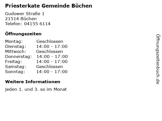| Öffnungszeiten Priesterkate Gemeinde Büchen in Büchen anzeigen | |
