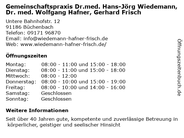 Branchen & Suchbegriffe zu Gemeinschaftspraxis Dr.med. Hans-Jörg Wiedemann, Dr. med. Wolfgang Hafner, Gerhard Frisch:dr., dr.med., frisch, gemeinschaftspraxis, gerhard, hafner, hans, jörg, med., wiedemann, wolfgang |