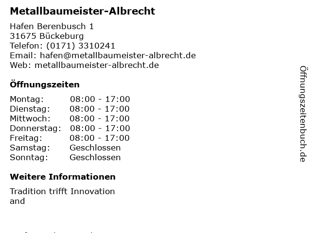 | Öffnungszeiten Metallbaumeister-Albrecht in Bückeburg anzeigen | |