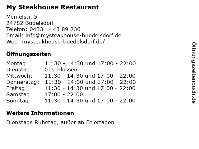 | Öffnungszeiten My Steakhouse Restaurant in Büdelsdorf anzeigen | |