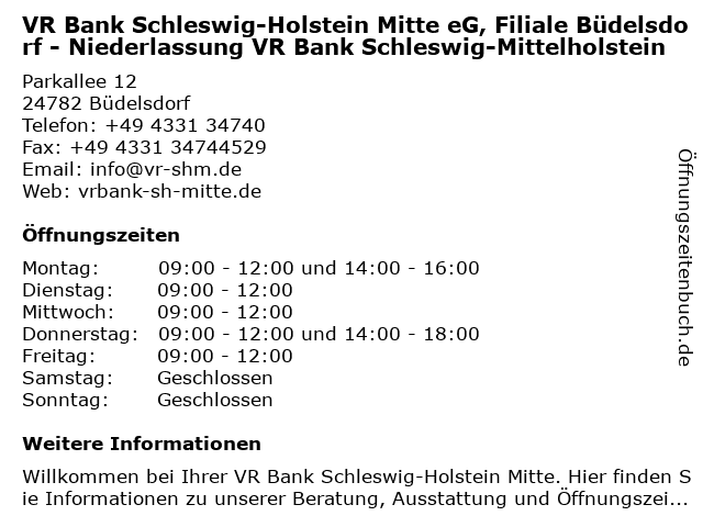 Branchen & Suchbegriffe zu VR Bank Schleswig-Holstein Mitte eG, Filiale Büdelsdorf - Niederlassung VR Bank Schleswig-Mittelholstein:bank, eg, holstein, mitte, mittelholstein, niederlassung, vr |