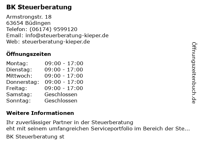 | Öffnungszeiten BK Steuerberatung in Büdingen anzeigen | |