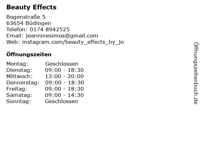 | Öffnungszeiten Beauty Effects in Büdingen anzeigen | |