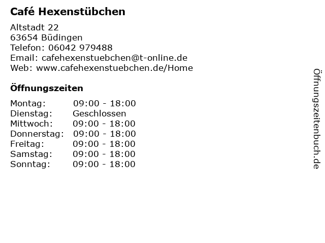 | Öffnungszeiten Café Hexenstübchen in Büdingen anzeigen | |