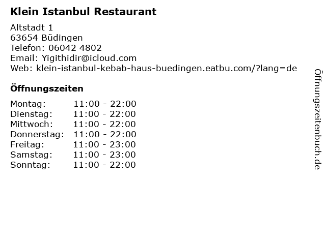 | Öffnungszeiten Klein Istanbul Restaurant in Büdingen anzeigen | |