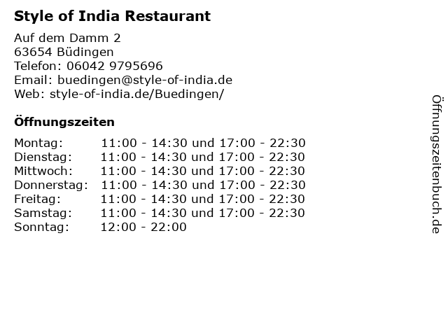 | Öffnungszeiten Style of India Restaurant in Büdingen anzeigen | |