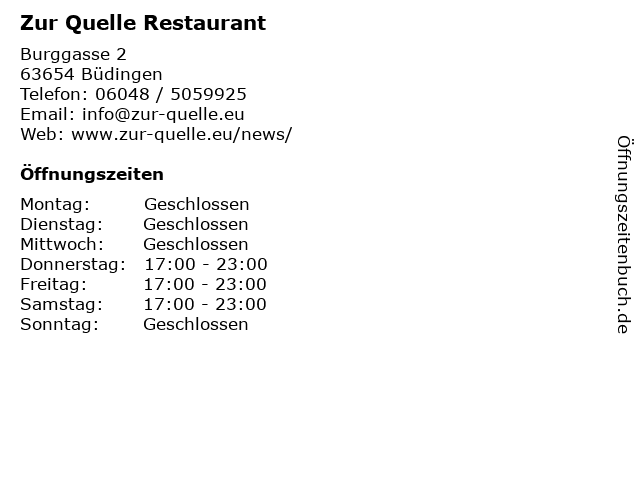 | Öffnungszeiten Zur Quelle Restaurant in Büdingen anzeigen | |