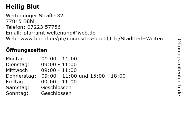 | Öffnungszeiten Heilig Blut in Bühl anzeigen | |