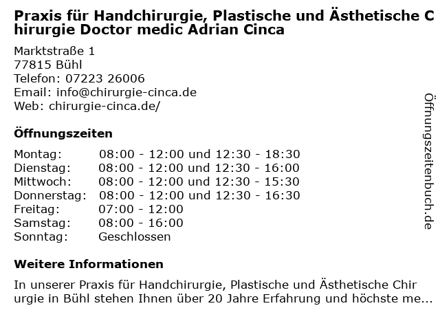 1 Dr. Oliver Mohr - Arzt für Chirurgie, Sportmedizin, Durchgangsarzt (Entfernung: 0,01 km) Marktstr. 1, 77815 Bühl 2 Dr.med. Gabriel R. Snounou Mund- Kiefer- und Gesichtschirurg Plastische Operationen (Entfernung: 0,04 km) Friedrichstraße 7, 77815 Bühl 3 Dr. Dr. Bibiana Kotrikova - Praxisklinik für Mund-, Kiefer und Gesichtschirurgie, Schwerpunkt Implantologie, Plastische-Ästhetische Operationen (Entfernung: 10,40 km) Sophienstr. 4, 76530 Baden-Baden 4 Privatpraxis Ortho.medic Dr. Nabegh G. Assad (Entfernung: 10,46 km) Lichtentaler Straße 1, 76530 Baden-Baden 5 Ästhetische Plastische Chirugie Baden-Baden Moderne Wellness (Entfernung: 10,49 km) Kapuzinerstr. 1 A, 76530 Baden-Baden 6 |