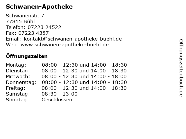 | Öffnungszeiten Schwanen-Apotheke in Bühl anzeigen | |