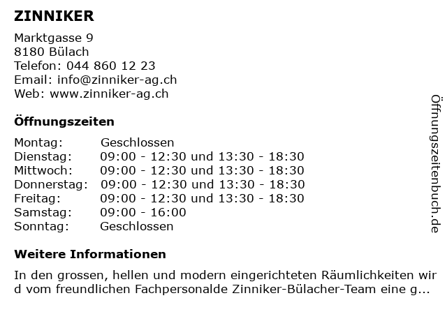 | Öffnungszeiten ZINNIKER in Bülach anzeigen | |