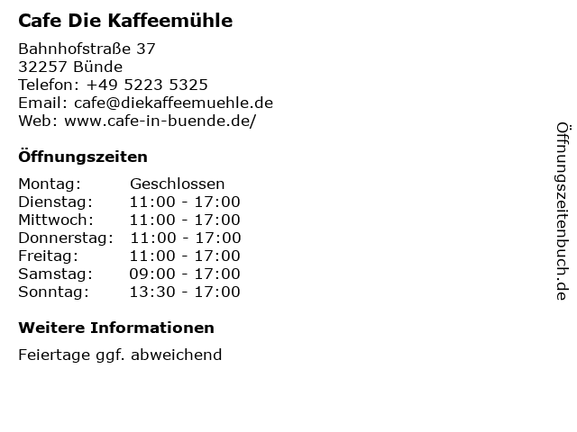| Öffnungszeiten Cafe Die Kaffeemühle in Bünde anzeigen | |