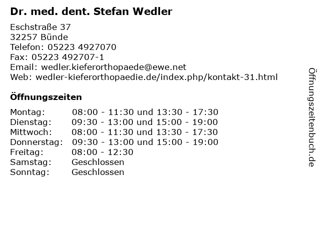 | Öffnungszeiten Dr. med. dent. Stefan Wedler in Bünde anzeigen | |