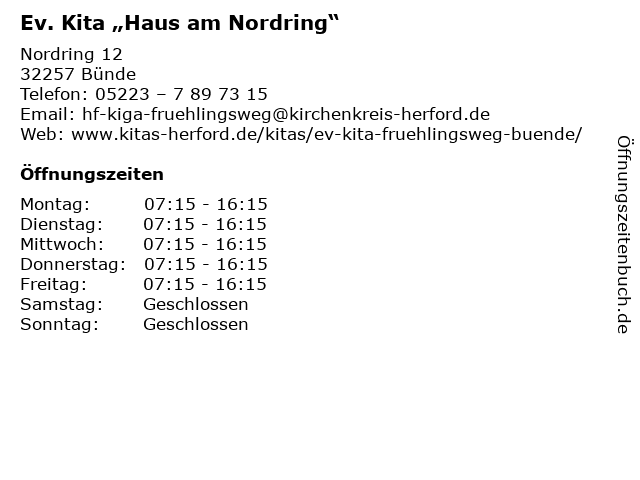 | Öffnungszeiten Ev. Kita „Haus am Nordring“ in Bünde anzeigen | |