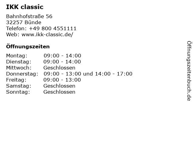 | Öffnungszeiten IKK classic in Bünde anzeigen | |