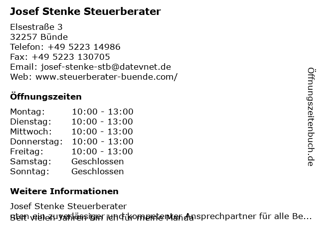 | Öffnungszeiten Josef Stenke Steuerberater in Bünde anzeigen | |
