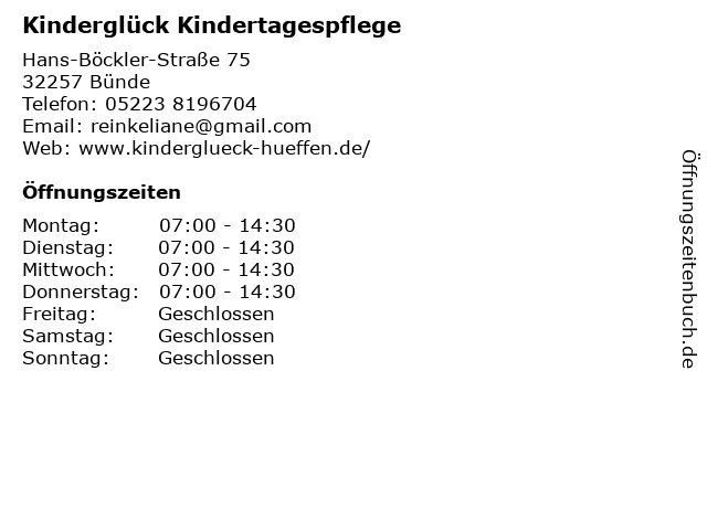 | Öffnungszeiten Kinderglück Kindertagespflege in Bünde anzeigen | |