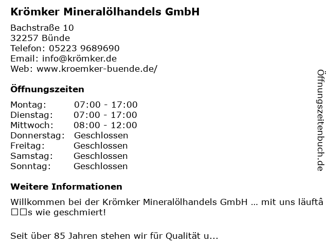| Öffnungszeiten Krömker Mineralölhandels GmbH in Bünde anzeigen | |