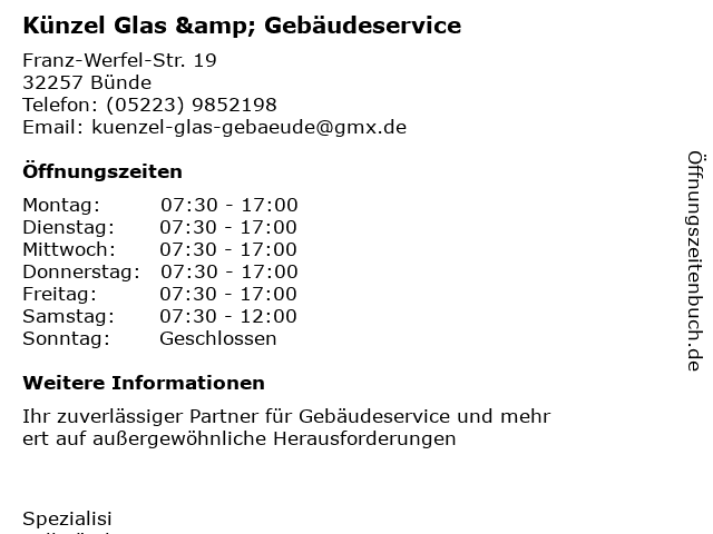 | Öffnungszeiten Künzel Glas & Gebäudeservice in Bünde anzeigen | |