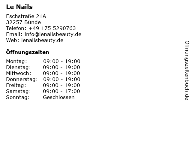 | Öffnungszeiten Le Nails in Bünde anzeigen | |
