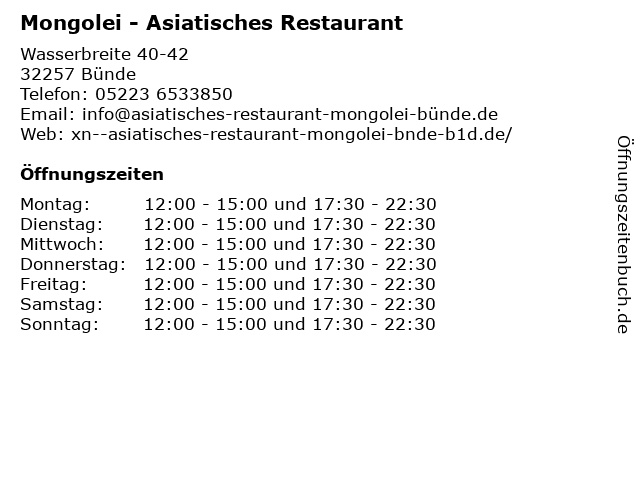 | Mittwoch | 12:00-15:00 und 17:30-22:30 |