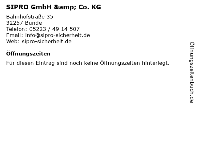 | Öffnungszeiten SIPRO GmbH & Co. KG in Bünde anzeigen | |
