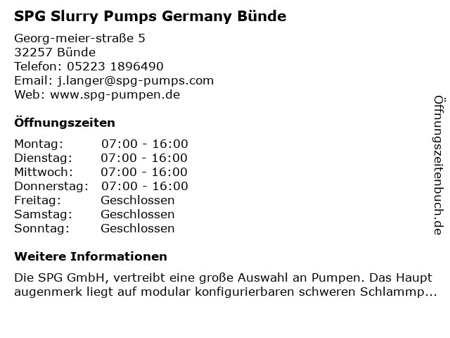 | Öffnungszeiten SPG Slurry Pumps Germany Bünde in Bünde anzeigen | |
