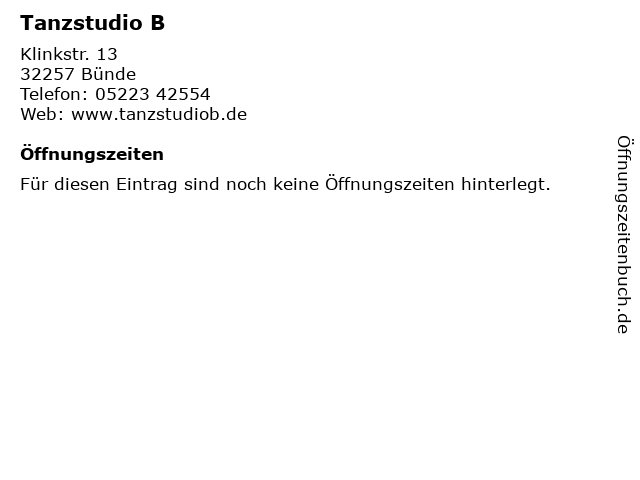 | Öffnungszeiten Tanzstudio B in Bünde anzeigen | |