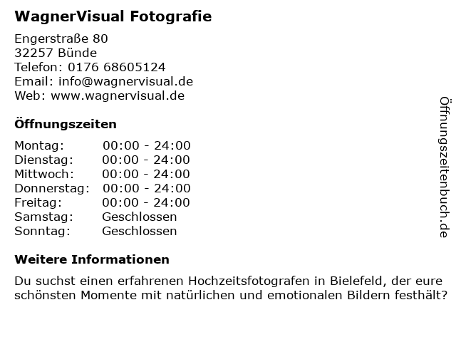 | Öffnungszeiten WagnerVisual Fotografie in Bünde anzeigen | |