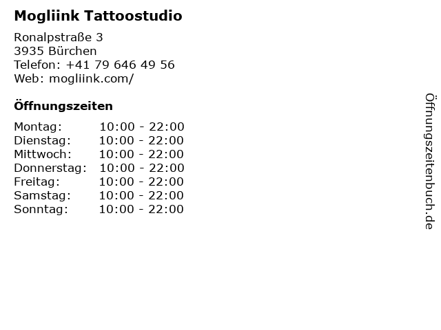 | Öffnungszeiten Mogliink Tattoostudio in Bürchen anzeigen | |