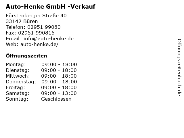 | Öffnungszeiten Auto-Henke GmbH -Verkauf in Büren anzeigen | |