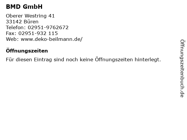 | Öffnungszeiten BMD GmbH in Büren anzeigen | |