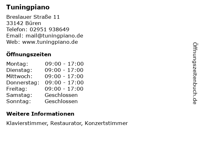 | Öffnungszeiten Tuningpiano in Büren anzeigen | |