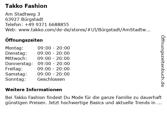| Öffnungszeiten Takko Fashion in Bürgstadt anzeigen | |
