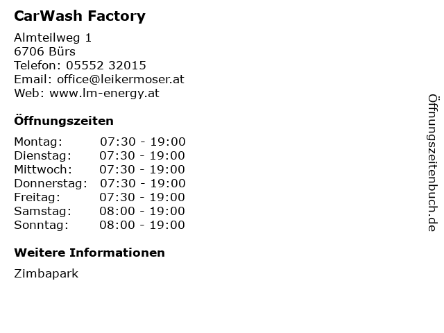 | Öffnungszeiten CarWash Factory in Bürs anzeigen | |