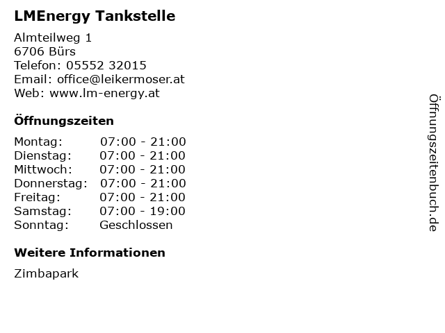 | Öffnungszeiten LMEnergy Tankstelle in Bürs anzeigen | |
