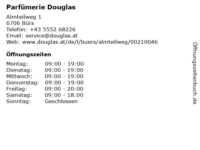 | Öffnungszeiten Parfümerie Douglas in Bürs anzeigen | |