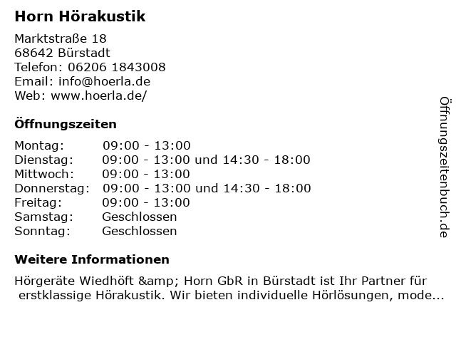 | Öffnungszeiten Horn Hörakustik in Bürstadt anzeigen | |