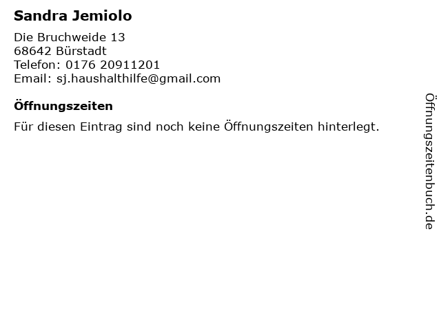 | Öffnungszeiten Sandra Jemiolo in Bürstadt anzeigen | |