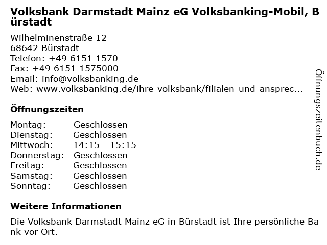 Branchen & Suchbegriffe zu Volksbank Darmstadt Mainz eG Volksbanking-Mobil, Bürstadt:bank, beratung, eg, geldautomat, genossenschaft, immobilienagentur, kredit, mobil, versicherung, volksbank, volksbanking |